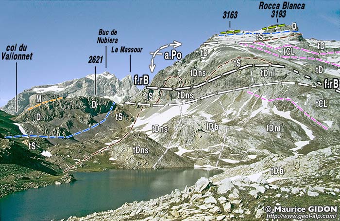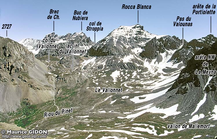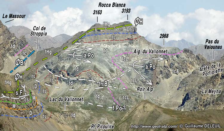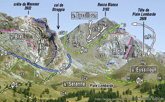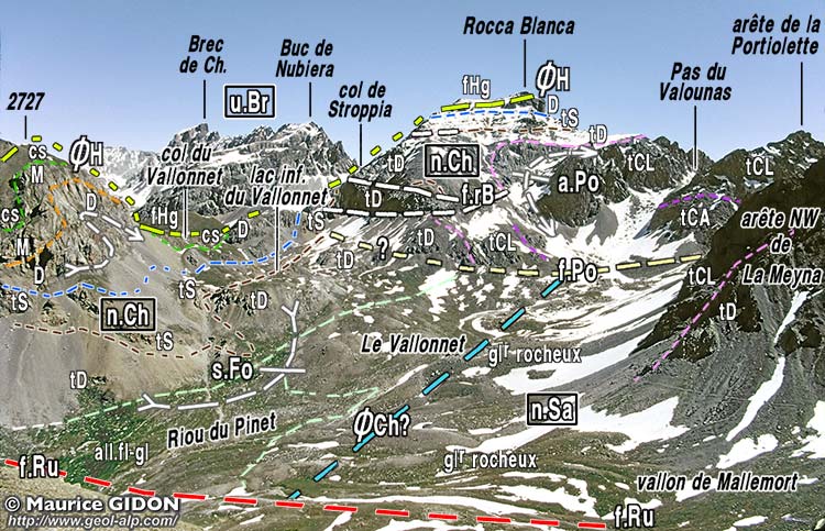 ![]() La dépression du Vallonnet vue d'ensemble, du sud-ouest, depuis la crête de Roir Alp (= Côte des Chamois). u.Br = unité du Brec (nappe du Châtelet) ; n.Ch = unité de Rocca Blanca (nappe du Châtelet) ; n.Sa = nappe de Sautron ; ØH = surface de chevauchement des nappes de flysch de l'Embrunais (fHg = flysch gréseux de l'Unité de l'Eyssilloun); ØCh? = tracé approximatif vraisemblable de la surface de chevauchement de la nappe du Châtelet (unité de la Rocca Blanca). f.Ru = faille du Ruburent ; s.Fo = synclinal de Fouillouse ; f.Po = faille de la Portiolette ; f.rB = failles "plates" de la Rocca Blanca : elles possédent un rejet extensif (lèvre supérieure décalée vers l'arrière droit) ; a.Po = anticlinal de la Portiolette. (voir la suite du paysage, vers la gauche, à la page "Rochers de Saint-Ours") |