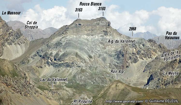 A la Rocca Blanca même les couches décrivent un anticlinal en genou dejeté vers le sud-ouest, dont la charnière est coupée presque en tangence par les escarpements qui tombent sur le Vallonnet. Sa position et l'azimut de l'axe de cet anticlinal de la Portiolette portent à y reconnaître le prolongement sud-oriental vraisemblable de l'anticlinal des Passets, bien visible plus au nord, au niveau de Fouillouse et des gorges de l'Ubaye. En effet s'il affleure à plus haute altitude pour des niveaux stratigraphiques comparables c'est sans doute l'effet prévisible de la remontée axiale de toutes les structures en direction du SE. Toutefois sa voûte anticlinale est ici plus anguleuse, presque en genou et rompue de diverses failles.