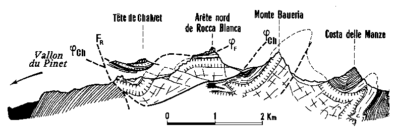 ![]() Coupe SW-NE passant par le col du Vallonnet (extrait de la publication n° 024, retouché) La partie droite de cette coupe montre le matériel de la nappe de Sautron (globalement ployé en un anticlinal déversé vers le NE). ØCh = surface basale de la nappe du Châtelet ; FR = faille du Ruburent (compartiment sud-occidental surélevé) ; La Tête de Chalvet n'est plus dénommée sur les cartes actuelles : elle correspond au sommet coté 2737 à l'est du col Sans Nom. |
