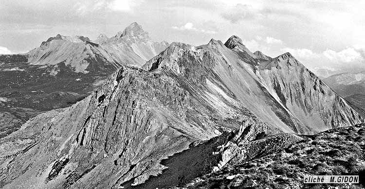 ![]() ![]() (extrait de la publication n° 024 ) Le chaînon de Tête Dure et du Bec du Lièvre : vue d'ensemble, du nord-ouest, depuis le sommet de Tête Dure (le point 2683 est la Cime des Palets). La faille du Ruburent est largement masquée car elle suit le pied des abrupts du côté gauche de la crête. Ce cliché montre l'attitude très redressée (subverticale) des couches triasiques qui forment la crête des Aiguillettes. On remarque qu'à la selle située immédiatement au sud des Aiguillettes de Combe Rémi (cliché suivant) les bancs du Dogger, moyennement pentés vers la droite, reposent en discordance sur la tranche des dolomies triasiques, subverticales. L'origine de cette disposition n'est pas élucidée avec certitude mais ne semble pas due à un accident tectonique : elle pourrait donc résulter d'un basculement des strates triasiques avant la sédimentation de celles du Jurassique. On distingue en arrière-plan la klippe de Moïse, qui appartient à la nappe de Sautron. |