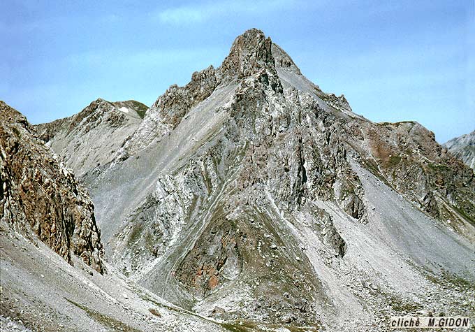 Ce contact pend vers le NE, vers l'intérieur du chaînon et fait reposer le matériel briançonnais sur celui de l'Embrunais, alors que ce dernier et normalement charrié sur le premier. Cela résulte de ce qu'il ne s'agit pas vraiment d'un contact de chevauchement mais d'une faille qui a été basculée par le ploiement de l'anticlinal du Rouchouse (voir à ce sujet la page "Larche"). |