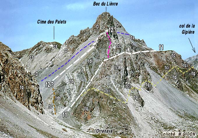 occidental) cela correspondrait à un jeu dextre. Cette conclusion semble en bon accord avec les connections qui existent, sur le versant italien, entre ce système de cassures et celui de la faille de Bersezio, dont le rejet dextre se manifeste de façon évidente au niveau de la limite entre autochtone et zones internes. La composante de soulèvement du compartiment occidental de la faille du Ruburent résulte donc peut être du fait que ce coulissement s'exerce sur un dispositif qui plonge vers le NW (de sorte qu'un mouvement dextre se traduit par un surhaussement relatif du compartiment occidental). On ne peut pas exclure non plus qu'il s'agisse d'anciennes failles extensives jurassiques : c'est ce que suggérerait la discordance du Dogger sur le Trias que l'on observe au nord du Bec du Lièvre (cf plus haut dans cette page). |