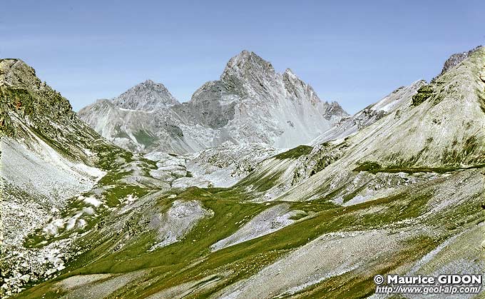 redessinée sur la base de la carte géologique d'ensemble des Alpes occidentales, du Léman à Digne, au 1/250.000°", par M. Gidon (1977), publication n° 074 Légende |