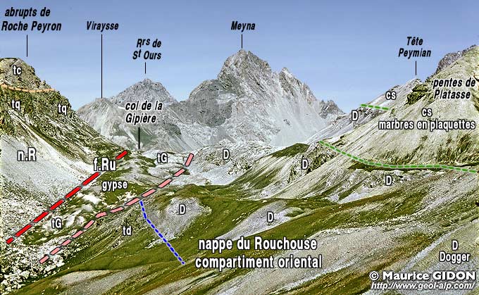 Les gypses du col de la Gipière sont très disloqués et représentent une sorte de brèche de faille*. Ils ne peuvent guère avoir pris place le long du plan de cassure qu'en remontant de la profondeur (par une sorte de diapirisme*), depuis la surface de charriage de la nappe du Rouchouse (un coussinet de telles roches s'observe effectivement, plus au sud, dans les secteurs du Ruburent et de l'Oserot le long de cette surface de charriage). |