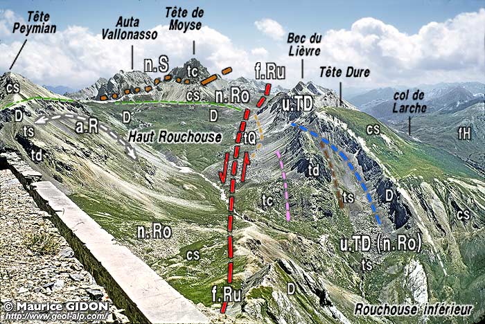 ![]() Le versant oriental de la vallée de l'Ubayette, à l'est et au sud-est de Larche vu du nord-ouest, depuis le Fort Lacroix (rive gauche de la vallée, en face de Saint-Ours). f.sO = accident de Saint-Ours, entre unité de Serenne (nappes de l'Embrunais) et nappes briançonnaises tordues par le flanc SW de l'anticlinal du Rouchouse (a.R). Aux abords du col de Larche cette surface est décalé par l'accident mineur qui sépare l'unité de Tête Dure (nappe du Rouchouse) de la nappe de Rocca Peroni (n.rP). |