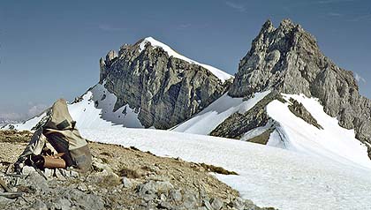 La barre des calcaires du Dogger, peu pentée vers la droite repose sur le Carnien schisto-bréchique, à patine ocreuse, qui forme la vire enneigée. Au contraire les affleurements gris sur lesquels est posé le sac à dos sont des dolomies ladiniennes dont les bancs sont presque verticaux. |