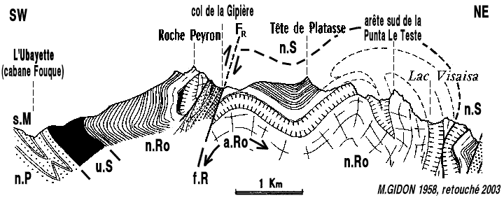 n.P = nappe du Parpaillon ; u.S = unité de Serenne ; s.M = synclinal de Meyronnes ; f.R = faille du Ruburent ; a.Ro = anticlinal du Rouchouse. Nappes briançonnaises (de bas en haut de l'empilement) : n.Ro = nappe du Rouchouse ; n.S = nappe de Sautron. |