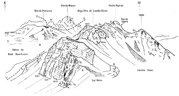 Cette assimilation de l'unité de Tête Dure à la nappe du Rouchouse est basée d'abord sur sa constitution, qui est très similaire. Mais surtout elle découle du sens du rejet vertical de la faille du Ruburent qui s'avère, au vu de ce que l'on observe ailleurs, correspondre à un soulèvement de sa lèvre sud-occidentale (voir en particulier le secteur du ravin du Pinet, à la page "Viraysse"). Par ailleurs l'hypothèse d'un rejet de sens opposé (abaissement de la lèvre sud-occidentale) amènerait à rattacher l'unité de Tête Dure à la nappe de Sautron. Or cela ne peut guère être envisagé en raison l'absence, à la semelle de cette dernière nappe, sur la transversale considérée ici, de toute trace du matériel siliceux permo-triasique, alors que celui-ci est présent sous les termes carbonatés de la nappe du Rouchouse, ainsi que de l'unité de Tête Dure). |