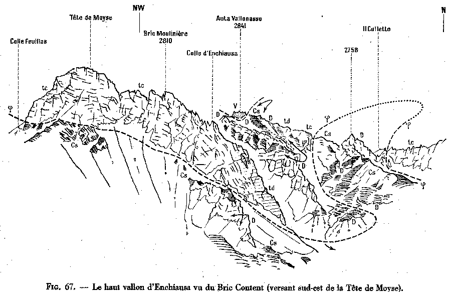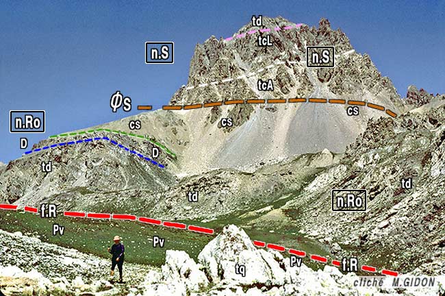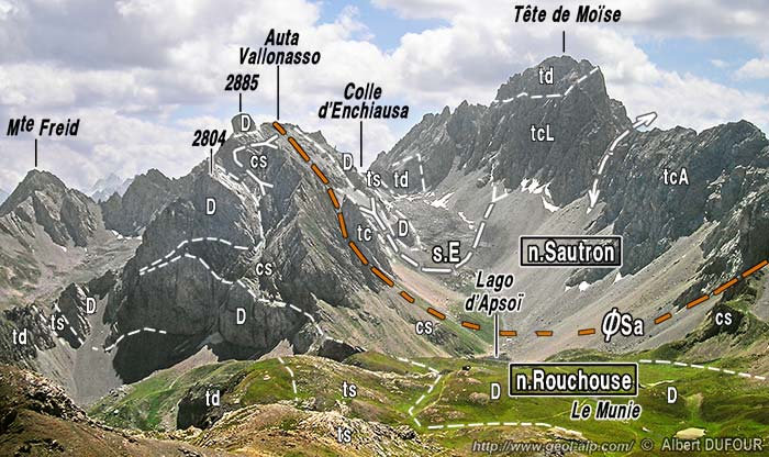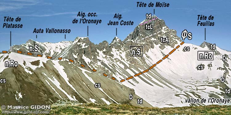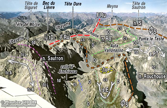 d'après une image extraite de "google-earth" Les environs septentrionaux de la Tête de Moïse (vue plongeante sur les deux versants de la crête frontière franco-italienne, vus du nord (voir, à la page "Unerzio sud", une image orientée en sens opposé). ØS = surface de chevauchement de la nappe de Sautron ; a.pT = anticlinal de la Punta Le Teste (axe plongeant vers le sud-est) ; ac.i = accident de l'Infernetto. |