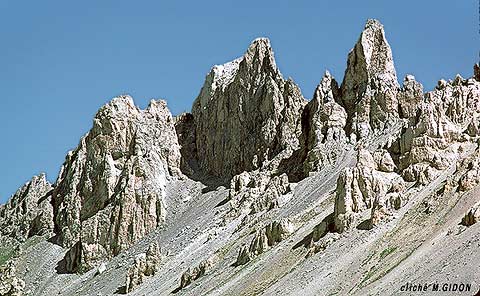 ![]() Les aiguilles occidentales d'Orrenaye vues du lac d'Orrenaye Relief typique des calcaires magnésiens du Trias moyen (ici clochetons du pied en calcaires anisiens, falaises en calcaires du Ladinien inférieur et extrème sommet en dolomies ladiniennes). |