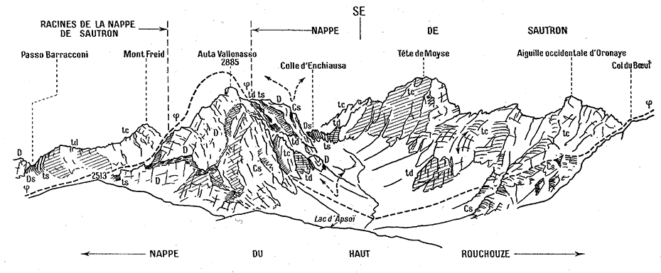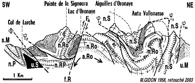 ![]() ![]() Coupe des chaînons au nord-est du col de Larche passant peu au nord-ouest de la Tête de Moïse. n.P = nappe du Parpaillon ; u.S = unité de Serenne ; Ø = accident d'Argentera (cassure limitant l'extension, vers le sud ouest, des nappes briançonnaises, se raccordant plus au sud à la faille de Bersezio) ; f.R = faille du Ruburent ; a.Ro = anticlinal du Rouchouse. Nappes briançonnaises (de bas en haut de l'empilement) : n.RP = nappe de Rocca Peroni ; n.Ro = nappe du Rouchouse (clivée par deux surfaces de chevauchement secondaires, qui individualisent les "écailles de Vaouclavia") ; n.S = nappe de Sautron ; u.M = unité de Marinet. (extrait de la publication n° 024, 1958, retouché) voir, en page Ruburent, une coupe passant à l'est de la Tête de Moïse. |