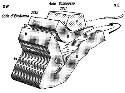 Les marbres en plaquettes qui occupent le coeur du synclinal d'Enchiausa supportent une lame de Dogger renversé, qui supporte à son tour, par l'intermédiaire de copeaux divers, une minuscule klippe de Verrucano : il faut sans doute rattacher cette dernière à l'unité de Marinet (on pourrait parler de dispositif en "klippe gigogne"!).