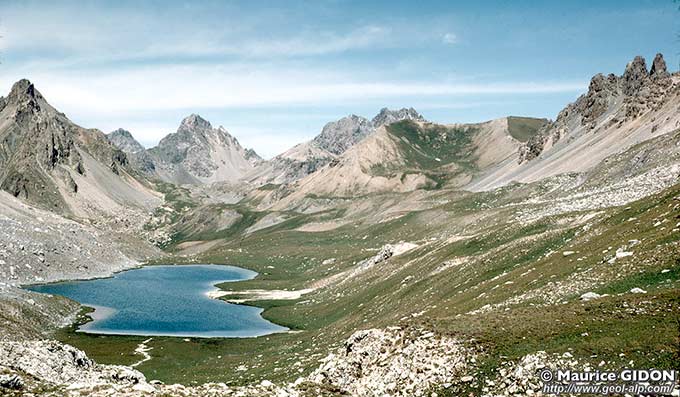 ![]() Les aiguilles occidentales d'Orrenaye vues du lac d'Orrenaye Relief typique des calcaires du Trias moyen (ici clochetons du pied en calcaires anisiens, falaises en calcaires du Ladinien inférieur et extrème sommet en dolomies ladiniennes). |