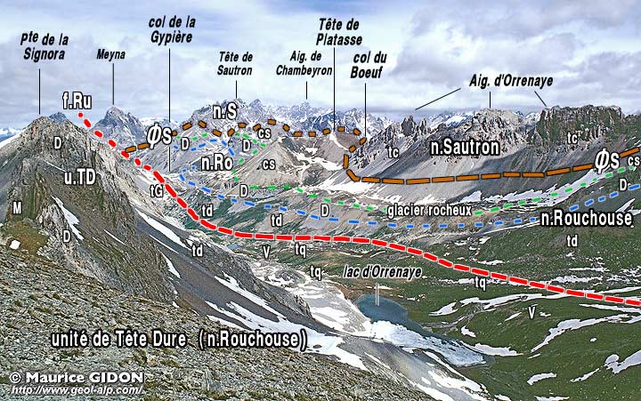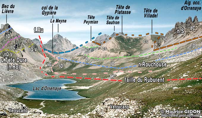 ![]() Le vallon et le lac de l'Orrenaye vus des pentes nord du col de Ruburent. En arrière-plan la ligne de tirets gras correspond aux surfaces de chevauchement (bases des nappes du Châtelet et de Sautron) qui ferment du côté nord la fenêtre* du Haut Rouchouse NB. La structure du Bec du Lièvre est ici schématisée à l'excès : voir les détails à la page "Tête Dure" . |