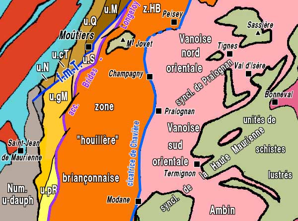 - ØVs = chevauchement du socle de la Vanoise septentrionale sur la zone houillère (au nord-est de La Plagne)