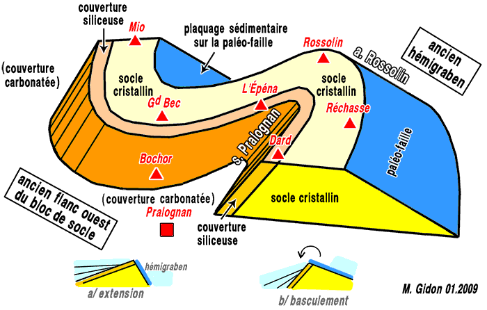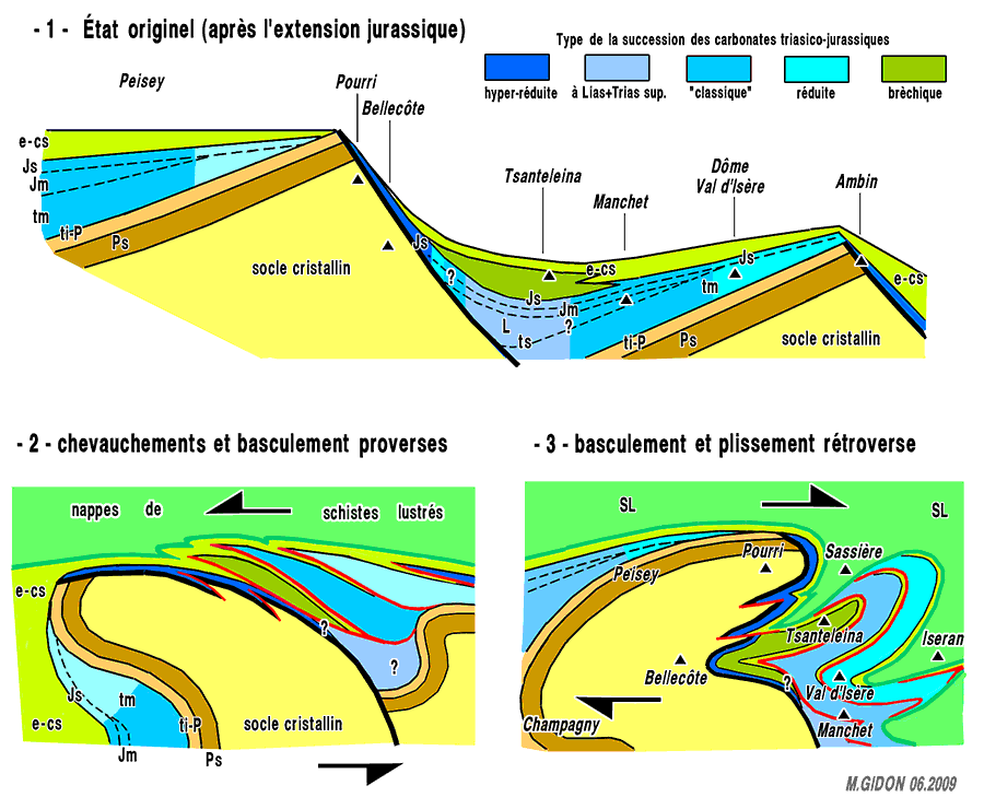 L'origine de ces rapports, très complexes, semble pouvoir être recherchée dans la déformation du système de blocs basculés invoqué plus haut : une première déformation, proverse, aurait tordu les blocs de socle en basculant vers l'ouest leur partie la plus haute ; il est vraisemblable qu'elle ait été déclenchée par l'arrivée des nappes de schistes lustrés et associée au débitage de la couverture en unités tectoniques imbriquées ; une déformation ultérieure, au contraire rétroverse, aurait agi sur ces unités charriées et sur la crête du bloc de socle pour les déformer en plis déversés vers le sud-est (cf. schémas ci-après).