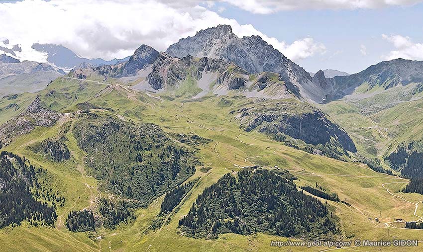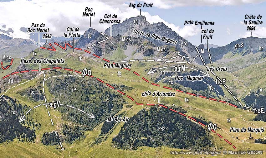 Vers le nord, dès la latitude du Roc Merlet, ce bombement anticlinal disparaît de nouveau sous le large nappage des cargneules qui forment les alpages de Plan Mugnier et qui s'étendent à la latitude du col de La Platta, jusqu'au lit du ruisseau de la Rosière pour rejoindre le reste de la nappe des gypses au Mont Charvet (voir la page "Dent de Villard"). Il réapparaît plus au nord, dès le passage des Chapelets, pour former les échines du Mont Bel Air mais celles-ci sont constituées par son cœur de houiller car sa voûte y est alors fortement débarrassée de sa couverture calcaire, sans doute par l'effet du rabotage tectonique induit par la mise en place de cette nappe des gypses.