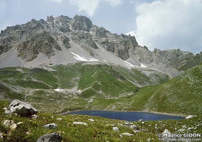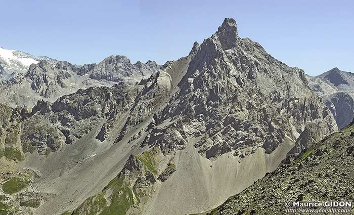 Sa pyramide rocheuse, d'aspect plutôt rébarbatif, est presque entièrement formée par les calcaires et dolomies triasiques. Du côté occidental ces couches donnent de hauts abrupts car leur hauteur d'affleurements est accrue du fait qu'elles y dessinent la charnière d'un grand pli d'axe presque N-S.