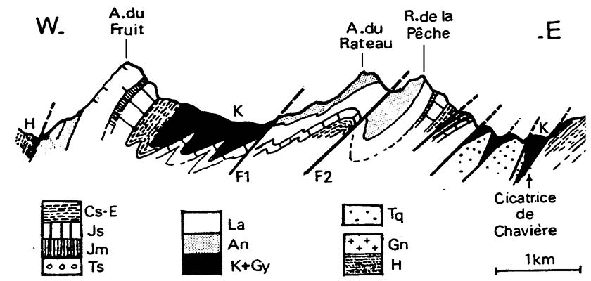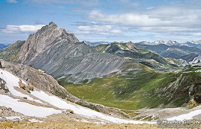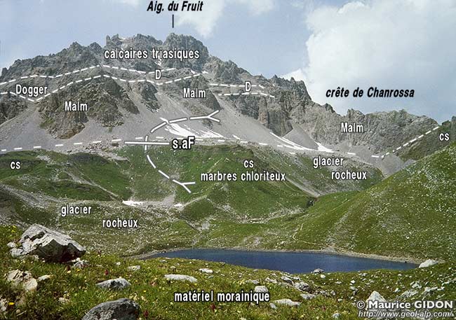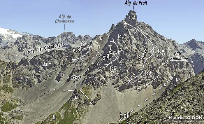 Elle y occupe toujours le coeur du synclinal de l'Aiguille du Fruit car c'est bien au flanc ouest de ce grand pli que se rattachent les replis de matériel carbonaté briançonnais de la crête de Plan Mugnier.