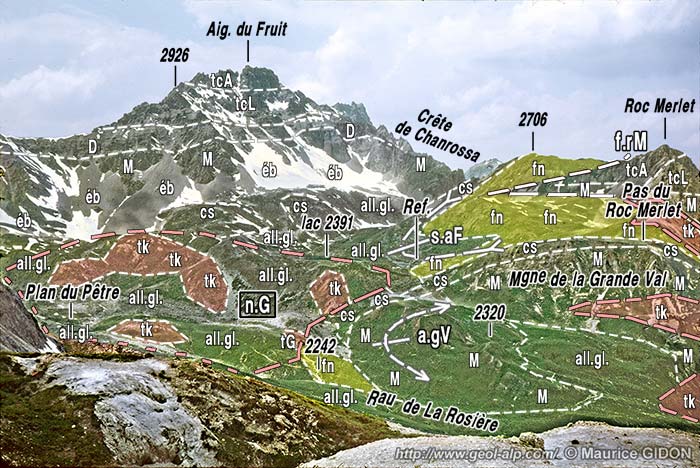 Du côté oriental du Roc Merlet le bombement anticlinal de la montagne de La Grande Val forme les alpages du pied de versant. Son flanc oriental est toutefois tranché par une cassure N-S qui a dû déterminer le tracé du torrent de La Rosière, bien qu'elle y soit masquée sous les cargneules du fond de vallon : elle surhausse en effet, par rapport au Malm et au crétacé supérieur de ce bombement, les calcaires triasiques qui forment sur le versant opposé la voûte anticlinale de la Petite Val (voir la page "Portetta"). De plus elle les juxtapose, plus en amont, à la succession renversée de l'Aiguille du Rateau (voir la page "Roc de la Pêche" et la coupe en haut de la présente page).