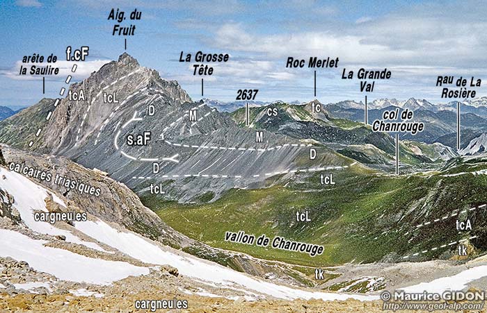 Par contre les affleurements du Roc Merlet sont dans une situation tectonique un peu énigmatique : en effet bien que constitués par des termes plus anciens (Trias calcaire) de l'unité de l'Aiguille du Fruit et franchement disposés en série renversée ils s'intercalent à l'est de ces derniers et reposent sur une intrication entre les cargneules et le flysch noir du cœur synclinal.