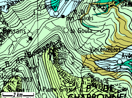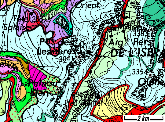Liste des notations utilisées pour les schistes lustrés (entre crochets correspondances avec celles des cartes B.R.G.M): |