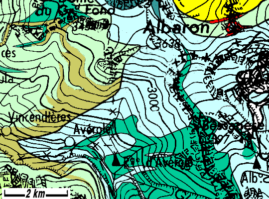 - la nappe de l'Albaron où une puissante dalle de serpentinites supporte des marbres jurassiques puis des calcschistes d'abord riches en passées de radiolarites.