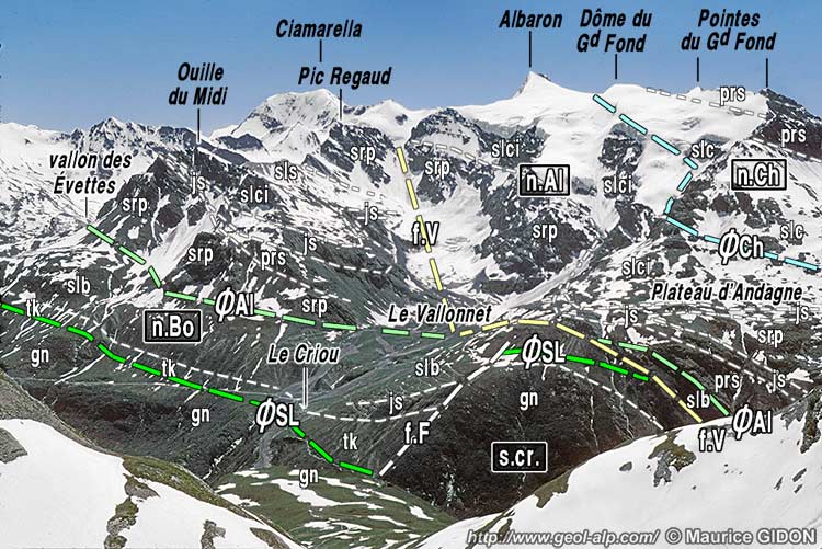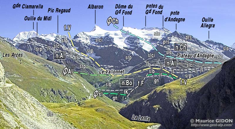 ![]() Le groupe montagneux de l'Albaron, vu du nord-ouest, depuis l'Ouille des Tré-Têtes (groupe de Méan Martin). n.Ch = nappe du Charbonnel ; n.Al = nappe de l'Albaron ; n.Bo = nappe de Bonneval ; Øsl = surface basale de chevauchement des nappes liguro-piémontaises. f.V = faille du Vallonnet ; f.F = faille du couloir de la Fontaine (voir la page "Bonneval") ; "prs" = prasinites ; "srp" = serpentinites ; "js" = marbres jurassiques recouvrant les roches vertes ; "slci" = schistes lustrés à passées de radiolarites de la nappe de l'Albaron. |