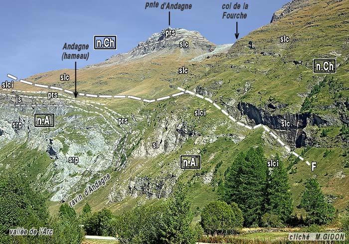 ![]() les crêtes de la rive gauche de la vallée de l'Arc au sud de Bonneval vues du nord, depuis la route de l'Iseran (D.902), versant Maurienne, peu en aval du Pont de la Neige. n.Ch = nappe du Charbonnel ; n.Al = nappe de l'Albaron ; n.Bo = nappe de Bonneval ; Øsl = surface basale de chevauchement des nappes liguro-piémontaises. f.V = faille du Vallonnet ; f.F = faille du couloir de la Fontaine (voir la page "Bonneval") ; "prs" = prasinites ; "srp" = serpentinites ; "js" = marbres jurassiques recouvrant les roches vertes ; "slci" = schistes lustrés à passées de radiolarites de la nappe de l'Albaron. |
