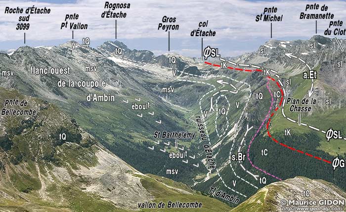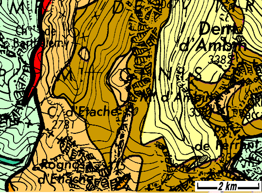 Dans les vallons de Savine et d'Ambin l'enveloppe sédimentaire de la coupole de socle a été presque complètement enlevée par l'érosion quaternaire ; elle n'y subsiste que sur les crêtes, et encore de façon discontinue. Par contre elle est bien conservée en rive gauche du vallon, plus occidental, d'Étache, entre le socle et la nappe des schistes lustrés qui forme toutes les crêtes de ce versant : on y observe que la retombée ouest de la coupole d'Ambin y dessine de façon assez spectaculaire un grand pli en genou, d'axe N-S et déversé vers l'ouest, l'anticlinal d'Étache. Ce pli s'avère relativement tardif, car il plisse également la surface de charriage des nappes de schistes lustrés.