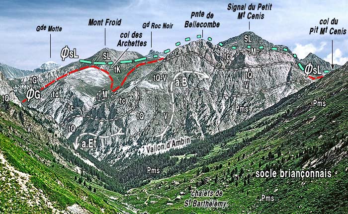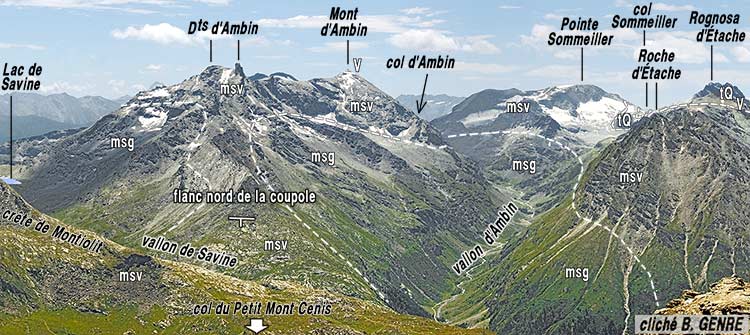 de la grosse coupole de socle cristallin (dont la voûte culmine aux abords de 3400 m) dans laquelle est sculpté le massif d'Ambin et ont ensuite largement entaillé ce socle. Les micaschistes qui le constituent sont pourtant beaucoup plus résistants à l'érosion que les couches de son enveloppe (gypses et schistes lustrés), qui affleurent à sa périphérie et que l'érosion a seulement affouillé au Mont Cenis.
