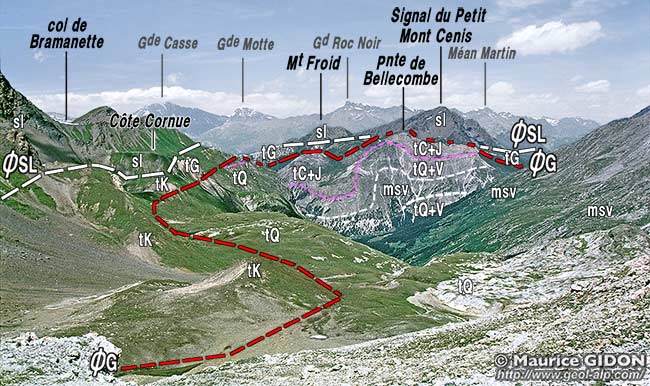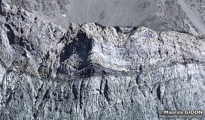 On note d'ailleurs que la couverture carbonatée de la Pointe de Bellecombe est affectée de petits failles inverses qui témoignent d'un cisaillement qui tendait à la décoller de sa semelle siliceuse. La présence de ces accidents indique qu'elle a été soumise à un effet d'entraînement vers l'ouest, ce qui est sans doute attribuable au passage de la nappe des schistes lustrés.
