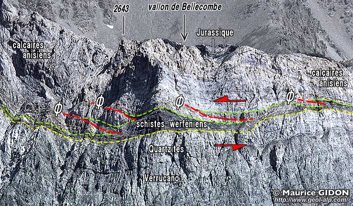 En raison de l'âge Trias supérieur des gypses on pourrait croire qu'ils représentent simplement la suite stratigraphique des calcaires et dolomies du Trias moyen qui garnissent le flanc ouest de la coupole anticlinale de ce massif. En réalité ces derniers terrains supportent eux-mêmes une succession réduite comportant du Jurassique et du Crétacé supérieur ; elle est conservée notamment sur le revers nord de la Pointe de Bellecombe, sous la surface basale des gypses et cargneules : cette dernière représente donc bien un chevauchement tectonique.