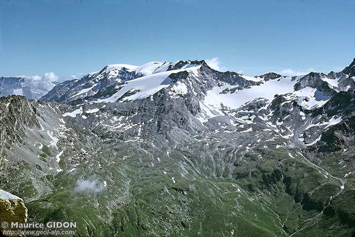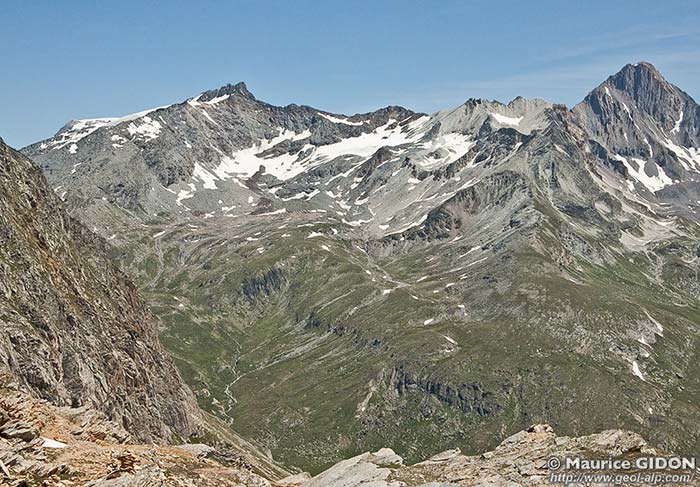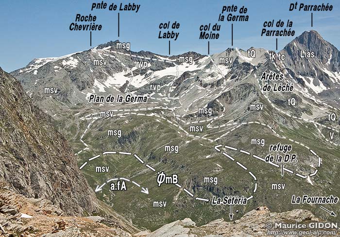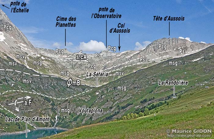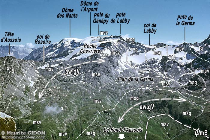 ![]() Les pentes orientales du fond d'Aussois, vues du sud-ouest, depuis le sommet de la Pointe de l'Échelle. aw.gV = "anticlinal occidental des glaciers de la Vanoise" = flexion générale à grand rayon de courbure du toit du socle cristallin . On observe sur ce versant qu'il y a répétition sur une même verticale des deux types de micaschistes du socle : le niveau msv (micaschistes supérieurs) réapparaît en effet sous les micaschistes inférieurs (msg). Ceci est interprété ici comme le prolongement sur ce versant de la vallée du chevauchement du Mauvais Berger ØmB (voir page "Rateau"). rvp = roches basiques métamorphiques d'âge paléozoïque, interstratifiées dans les micaschistes de l'Arpont (msg). |