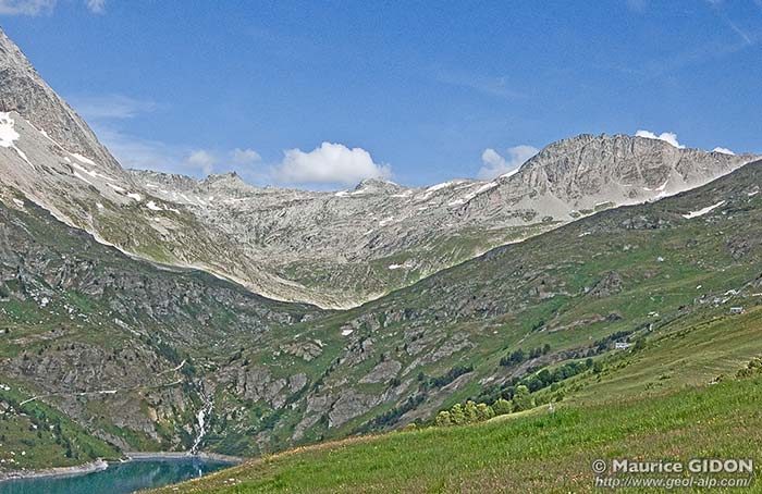 Au SE du refuge de la Dent Parrachée (qui est installé sur l'échine séparant les vallons de la Germa et de la Fournache), le versant oriental de la dépression du lac de Plan d'Amont est également sculpté, sous le chapeau calcaire de la Dent Parrachée, dans le socle cristallin et sa couverture siliceuse adhérente (voir la page "Aussois amont"). La répartition des affleurements de ces couches est compliquée par le fait qu'elles sont affectées de plis et que leurs axes pendent dans le même sens que la pente topographique. Il montre au total un relief mamelonné, où les micaschistes du socle supportent des chapeaux de quartzites triasiques en situation plus ou moins synclinale.