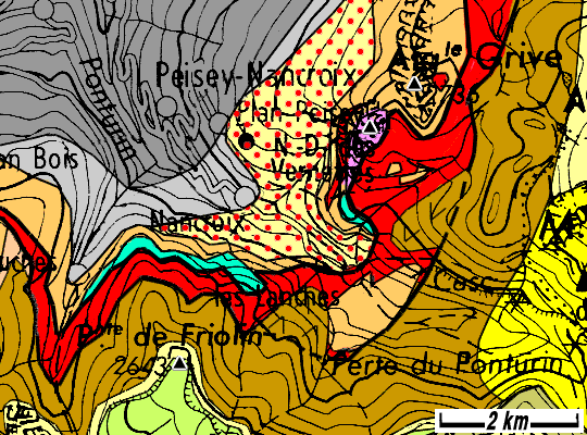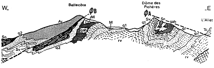 Le dessin ci-dessous est reproduit ici parce qu'il donne le détail des formations paléozoïques, selon une coupe qui semble, en fait, être peu oblique à l'axe de la voûte anticlinale du Cul du Nant. Mais il fait curieusement état, dans les escarpements orientaux du Dôme des Pichères, d'une structure synclinale d'axe N-S que rien ne permet de déceler, ni sur les diverses vues que l'on en a (notamment le cliché ci-dessus), ni dans le dessin de la carte à 1/50.000°.