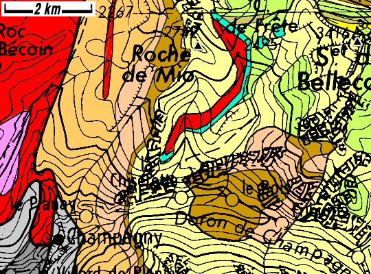 La coupe du versant nord de la montagne montre que ce socle y est partagé en deux tranches superposées, l'une (inférieure) à l'envers, l'autre (supérieure) à l'endroit, qui sont séparées par un puissant niveau de roches broyées en ambiance métamorphique (mylonites*). Cette inversion de polarité suggère que ces mylonites constituent le coeur d'un vaste pli couché (l'anticlinal de Bellecôte). Cette interprétation semble trouver une confirmation, plus à l'ouest (sous la Roche de Mio), dans le fait que les niveaux permo-triasiques y dessinent une vaste charnière, l'anticlinal de Mio, dont l'axe serait approximativement SW-NE (voir la page "Montchavin"). Ce semble donc être là un pli majeur, qui a d'ailleurs dû se former dans un épisode relativement précoce car il est repris et recoupé par divers autres accidents.