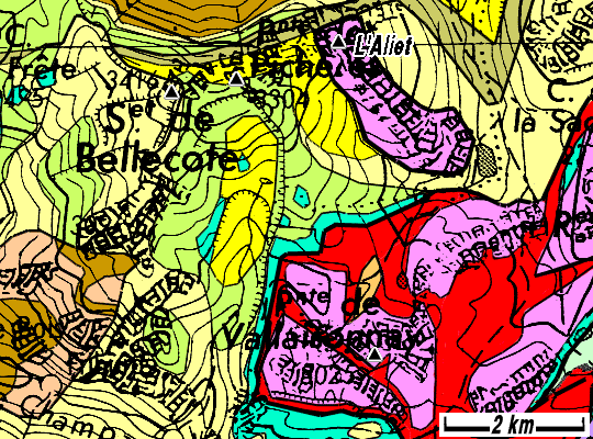 Enfin le massif supporte à son rebord oriental une klippe de matériel calcaréo-dolomitique, qui constitue la crête acérée de l'Aliet. Ce lambeau tectonique, à peine séparé de celui du Vallaisonnay, repose sur une surface de charriage qui est mise à nu par l'érosion dans les pentes orientales du dôme des Pichères, puis qui détermine le vallon de Plan Richard. Elle y sectionne toutes les structures affectant la série paléozoïque (mais cela ne suffit cependant pas pour considérer ces dernières comme anté-alpines puisqu'elles affectent aussi le Permo-Trias).