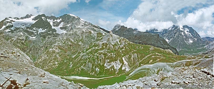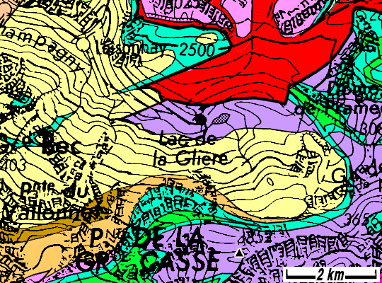 Mais dans ces pentes méridionales la surface du socle cristallin est en outre assez largement garnie par des placages sédimentaires calcaires : ils sont très comparables à ceux affleurant plus à l'ouest aux alentours du col de la Chiaupe et sont attribués comme eux au Jurassique. En tous cas ils témoignent, par leur repos très discordant sur les termes anté-triasiques ainsi dénudés, d'une mise à nu du socle cristallin pendant la sédimentation mézozoïque.