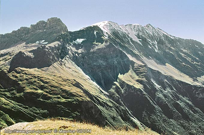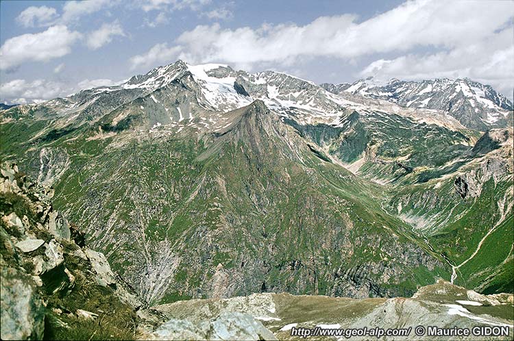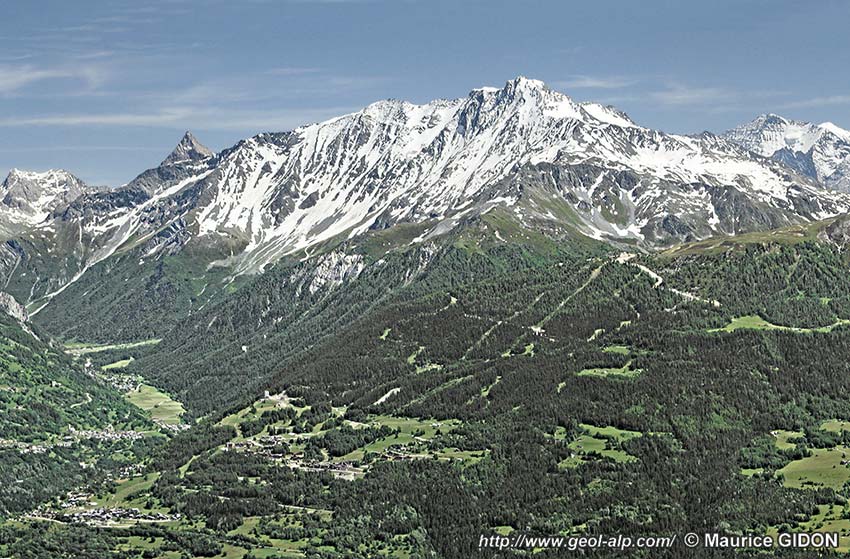 ![]() Le massif de Bellecôte vu du nord-est, depuis les pentes occidentales du Mont Pourri (ancien refuge Regaud). La structure du ravin de Tumelet peut s'interpréter comme la réapparition septentrionale du flanc oriental de l'"antiforme" de Friburge, visible dans la vallée du Doron de Champagny (voir ci-dessus et à la page "Champagny"). En effet elle affecte comme elle, avec une même forme, approximativement en genou déjeté vers l'est, les couches permiennes du soubassement du massif de Bellecôte, disposées dans les deux cas en série renversée. |