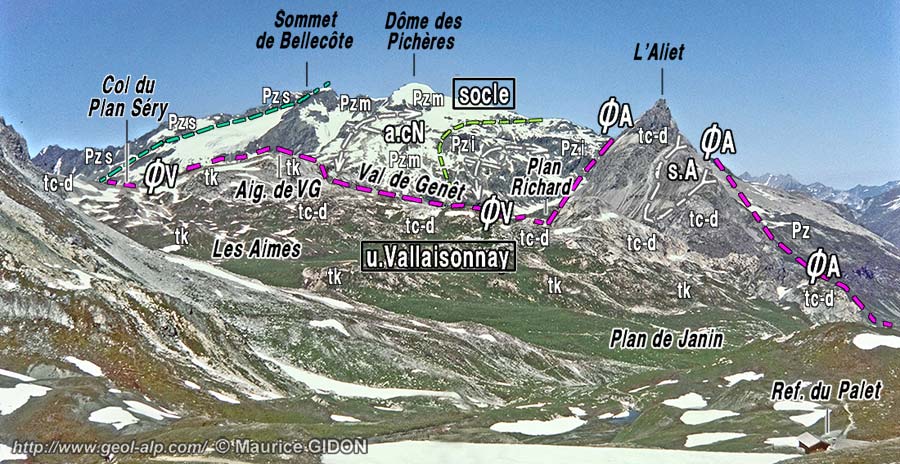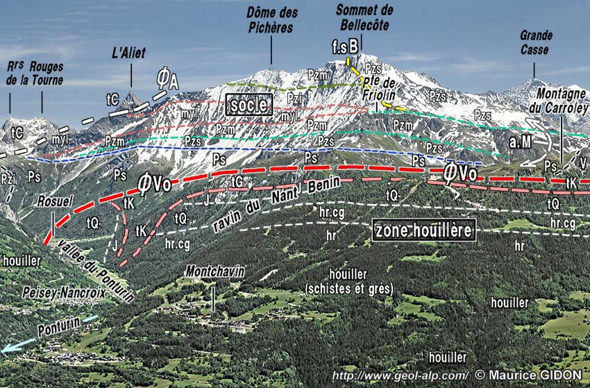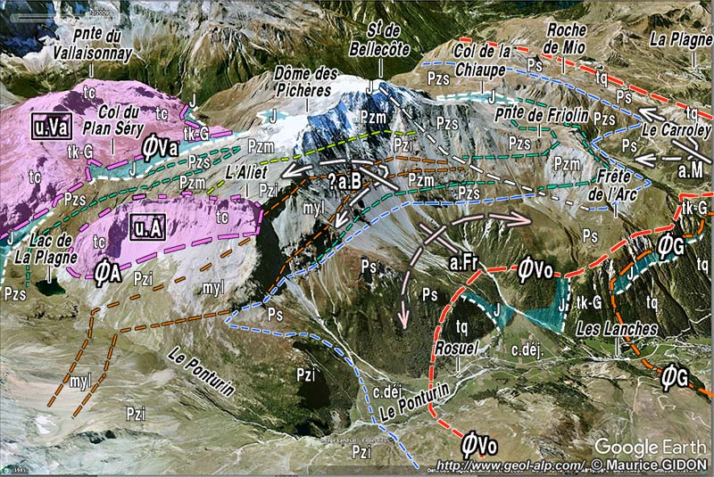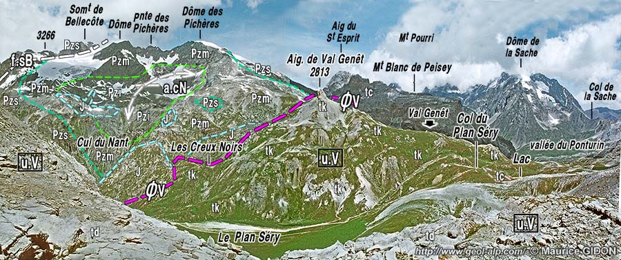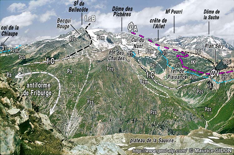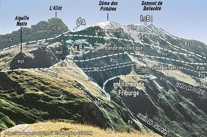 ![]() Le versant méridional de la montagne de Bellecôte vu du sud depuis le sommet de la Becquetta (contreforts nord du Grand Bec). f.sB = faille du sommet de Bellecôte ; ØA = surface de chevauchement de l'Aliet ; ØV = chevauchement du Vallaisonnay ; f.C = faille des Chardes. "J?" = marbres mésozoïques, probablement jurassiques ; "Pzs", "Pzm", "Pzi" = termes superposés (supérieur, moyen et inférieur) du paléozoïque anté-Permien. L'entaille du Doron met ici en évidence la retombée orientale de la structure appelée "antiforme de Friburge" qui fait réapparaître le Permien sous le Paléozoïque (voir aussi la page "Champagny"). Ce nom est dû à son interprétation historique comme un pli en genou déjeté vers le sud-est qui enroulerait la série renversée du socle charrié du massif de Bellecôte. Comme dans la vallée du Ponturin (voir aussi la page "Peisey") l'aspect de cette structure ne correspond cependant que d'assez loin à un vrai dessin anticlinal. |