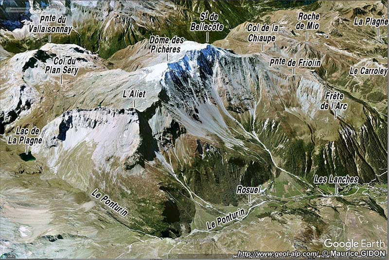Du côté méridional le sommet de Bellecôte tombe vers le SW sur le Doron de Champagny par des pentes aussi abruptes que celles de son versant nord (du Ponturin) et qui l'entaillent presque aussi profondément (voir la page "Champagny"). Par contre en direction du SE le revers de sa crête principale s'abaisse beaucoup plus progressivement jusqu'à rejoindre le vallon E-W du Plan Séry. Il y disparaît finalement en s'enfoncant sous les unités charriées constituées de matériel triasique calcaréo-dolomitique, qui forment le groupe montagneux de Vallaisonnay.