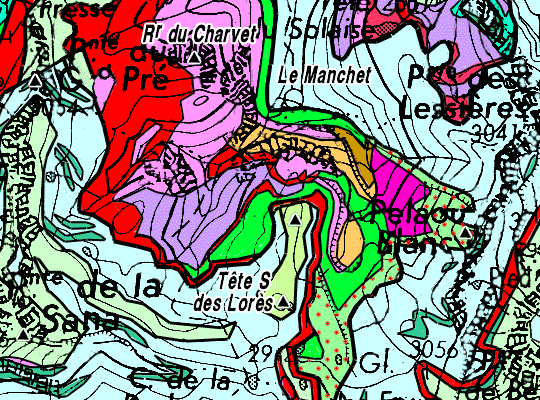 Au sud du Manchet cette bande de matériel briançonnais se poursuit jusqu'aux crêtes des Fours où elle se termine par une structure globalement anticlinale qui est enveloppée par la nappe ligure de Méan Martin (voir la page "Fours"). Cette apophyse méridionale que dessine sur la carte le système globalement déversé vers le SE des unités de Val-d'Isère semble donc correspondre globalement à un anticlinal de nappes (voir remarques générales ** en fin de page). |