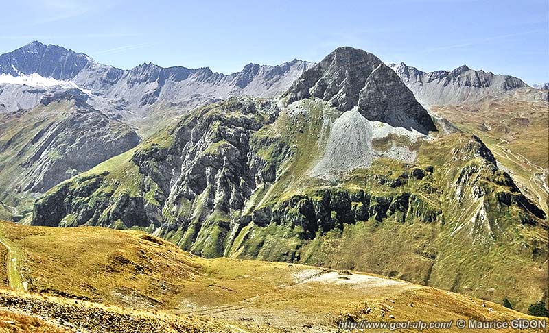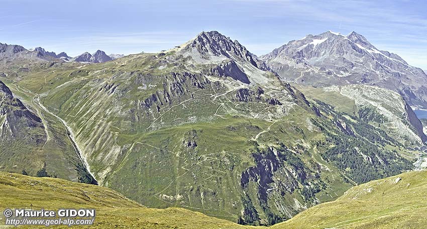 Ces deux montagnes ont l'une comme l'autre une partie supérieure qui est constituée par une épaisse dalle de couches carbonatées (calcaires et dolomies) du Trias moyen, ce qui atteste clairement de leur appartenance à la zone briançonnaise. Dans les deux cas aussi cette dalle s'enfonce vers l'ouest sous les cargneules de la nappe des Gypses, qui constituent les alpages suspendus du Grand Pré et de La Tovière (voir la page "Tovière"). L'entaille du thalweg de la Calabourdane montre que le soubassement de leur matériel briançonnais est constitué par les schistes lustrés de la nappe de Méan Martin qui constituent aussi la rive opposée de la vallée. Au sud du village du Châtelard il les recouvre par chevauchement mais au nord de ce village ce matériel briançonnais semble se raccorder à celui des pentes du Solaise d'une façon sans doute synclinale (toutefois ce raccord y est perturbé par le passage de la faille NW-SE de Solaise : voir la page "Val-d'Isère").