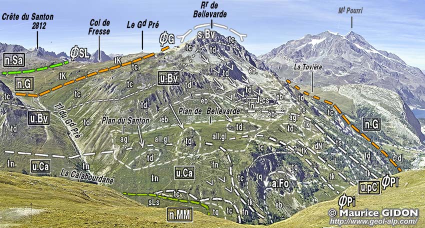 Dans la partie haute de la montagne les couches calcaréo-dolomitiques du Trias moyen, qui affleurent au sommet et sur sa crête sud, s'avèrent être disposées à l'envers et appartenir donc à une unité de Bellevarde distincte de celles du Rocher du Charvet (où les couches de même âge sont à l'endroit). En fait ces couches sommitales décrivent un pli antiforme* déjeté vers le nord dont le cœur semble être occupé, plus bas dans le versant, par l'anticlinal du Fornet (voir cliché précédent). L'axe, presque E-W, de ce synclinal de Bellevarde plonge vers l'ouest, de sorte que la voûte antiforme des calcaires ladiniens de ce pli s'enfonce dans cette direction sous les cargneules des alpages du Grand Pré.