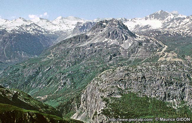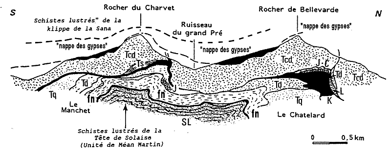 ** Les rapports entre les unités de Val-d'Isère méridionales apparaissent capricieux et dénués de logique structurale. En fait deux thèmes de déformation se dégagent de leur examen d'ensemble: Au demeurant ces bizarres agencements d'unités se développent au cœur d'un grand anticlinal déversé vers le SE que dessine la nappe de schistes lustrés de Méan Martin, laquelle est repoussée en rétro-chevauchement* sur les nappes ligures de Maurienne par un accident cargneulique prolongeant l'unité du Prariond (voir la page "Galise"). |