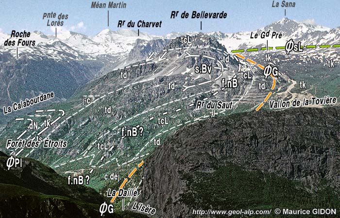 En fait cette disposition doit sans doute s'interpréter en prenant en compte la grande vraisemblance du prolongement, dans ce versant, de la faille nord de Bellevarde : celle-ci peut alors apparaître comme le résultat de la rupture de la charnière d'un pli ancien (dont semble témoigner les polarités inverses des strates de ses deux lèvres), le tout ayant postérieurement été tordu par le rebroussement vers le SE de l'antiforme de Bellevarde.