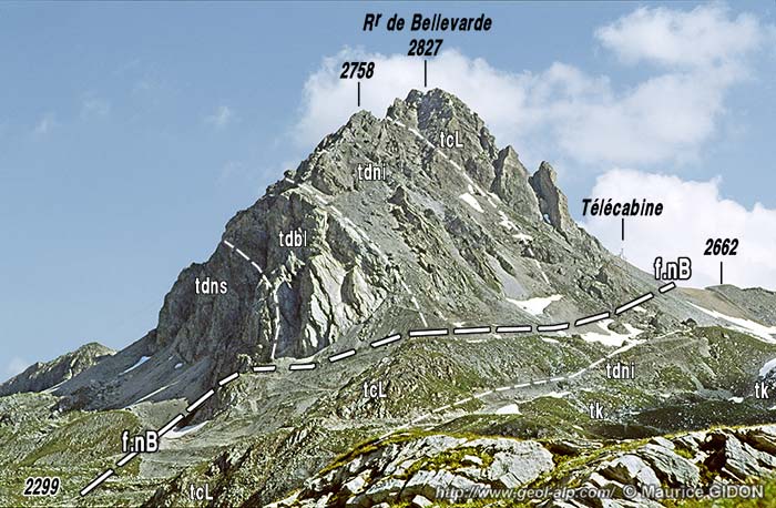 C/ Les abrupts septentrionaux du sommet de Bellevarde, formés par les couches du Trias moyen, appartiennent déjà à la retombée nord de l'antiforme synclinale de Bellevarde, déversée là vers le vallon de la Tovière.