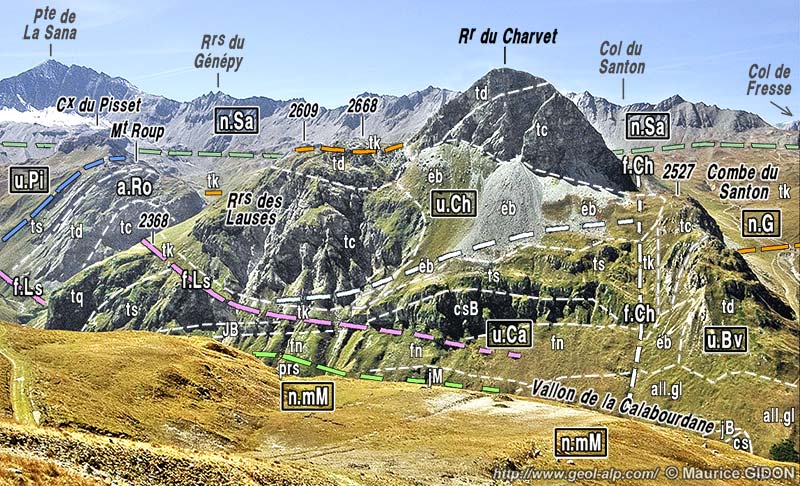Les pentes inférieures du Charvet montrent des affleurements à partir desquels on a défini l'unité de la Calabourdane. Ici disposée en succession renversée, elle est essentiellement représentée par du flysch noir (qui repose ici sur une dalle de conglomérats du Crétacé supérieur). Ce dernier héberge en outre des copeaux de marbres sans doute jurassiques qui sont interprétés comme des olistolites* et sont typiques de cette unité. Ses couches y reposent sur les schistes lustrés de la nappe de Méan Martin par un contact tectonique qui doit donc être compris comme un chevauchement renversé. En effet ces schistes lustrés ne font que prolonger vers le haut ceux qui forment les pentes de rive droite du vallon, lesquelles s'élèvent jusqu'à la crête de l'Arselle, au sud de la Tête du Solaise (voir la page "Val-d'Isère").