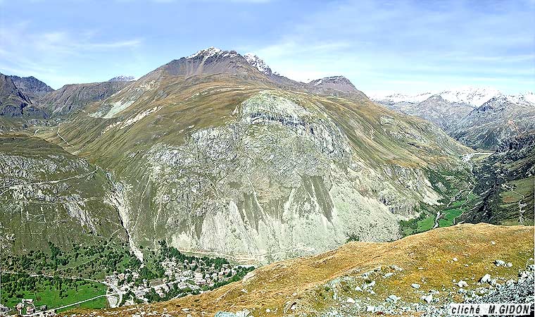 La vallée supérieure de l'Arc à Bonneval, vue de l'ouest depuis le premier lacet de la route de l'Iseran.
